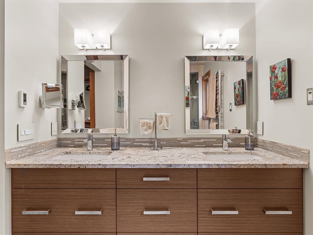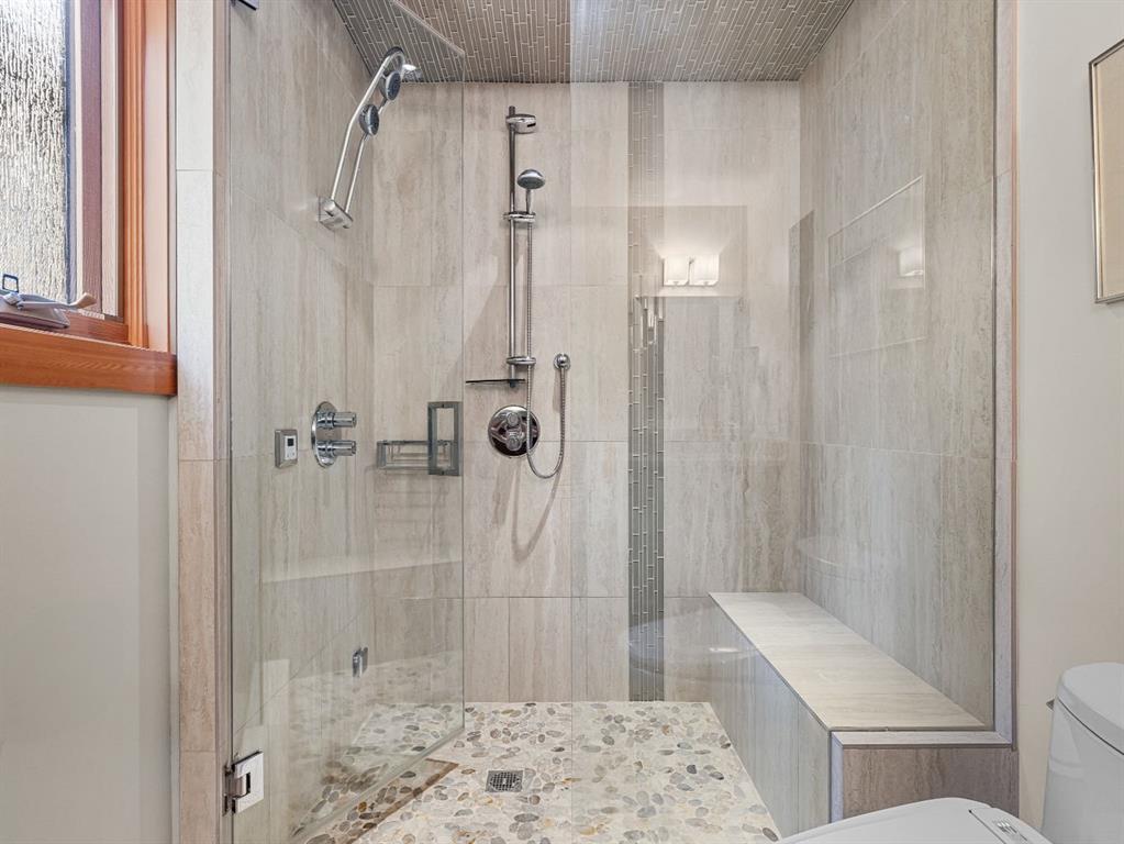 The home features two beautiful and spacious primary retreats. The main floor suite is filled with natural light and has a stylish walk-in closet. It also offers a spa-inspired ensuite with dual sinks, a steam shower, heated towel bar, and a Toto toilet with bidet seat. Head up the stunning, open riser stairs to the second primary suite which offers a similar luxurious ensuite, with the addition of a deep soaker tub.