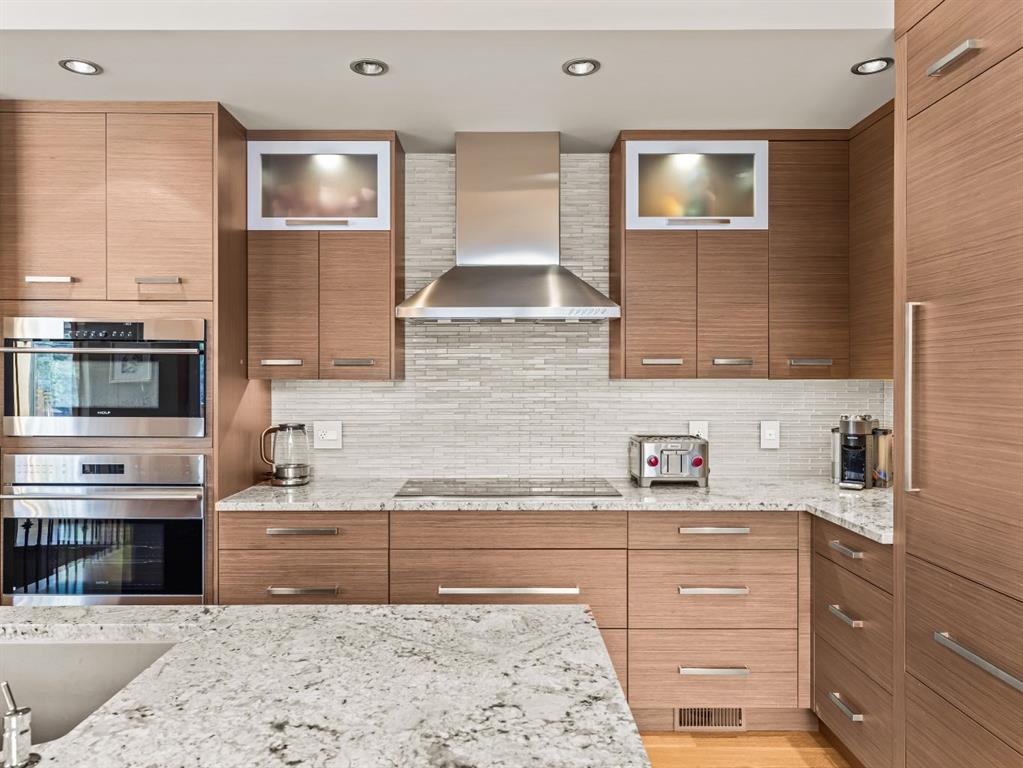 At the heart of the main level is a custom walnut kitchen designed for both daily living and entertaining. A spacious granite island anchors the space, while top-tier Sub-Zero and Wolf appliances, including a Sub-Zero wine and beverage fridge, Wolf induction cooktop, wall oven, and steam oven make this a chef’s dream. Practical luxury is everywhere: an Everhot water tap for instant tea, a Kinetico soft water and filtration system, a discreet built-in Hailo step ladder tucked into the base cabinetry, and thoughtful storage solutions that elevate functionality without compromising beauty.
